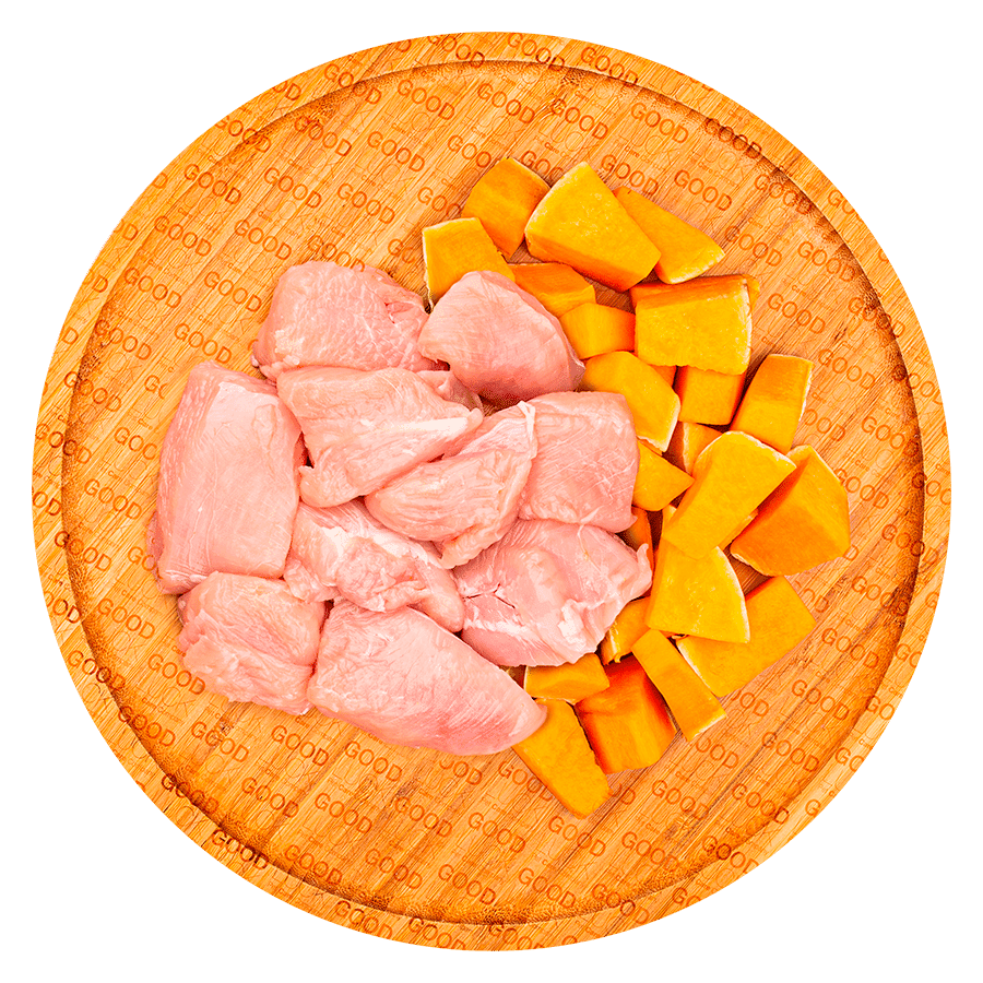Sus únicos componentes son un 75% filete de pollo sin hueso, sin grasa, sin piel y sin huesos y un 25% de calabaza.