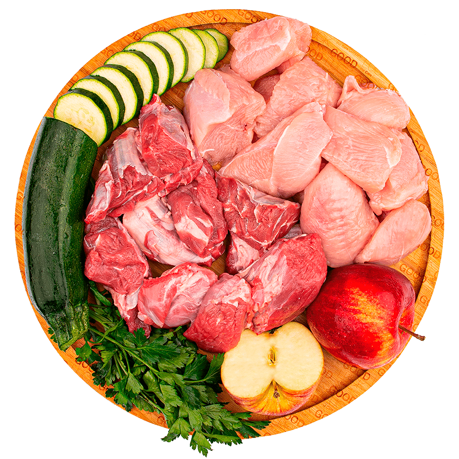 Los Nat's de ternera con pollo para perros de Good Luck están elaborados con 55% de ternera, 30% de pollo, 10% de verduras y 4% de fruta.